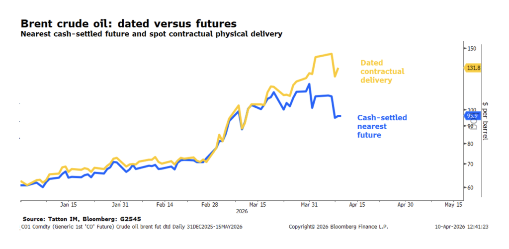 Markets might therefore be too optimistic. There is a disconnect between the relief in oil and equity markets, and the scramble for resources we see in the real economy. This is clearest in the difference between current oil prices and so-called spot dated price – which guarantee future oil delivery, a little different to a standard futures contract. The chart below shows spot dated oil price for June delivery is nearly 40% above the current near-contract futures prices, reflecting an extreme supply crunch in the next few weeks: