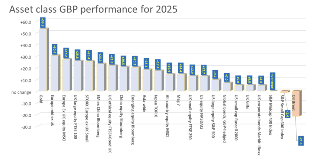 We will give a more detailed review of asset and sub-asset class performances for 2025 in next week’s missive. In the meantime, we show many of the year’s sterling-based returns , ranked from best to worst. A very Happy New Year to all of you!