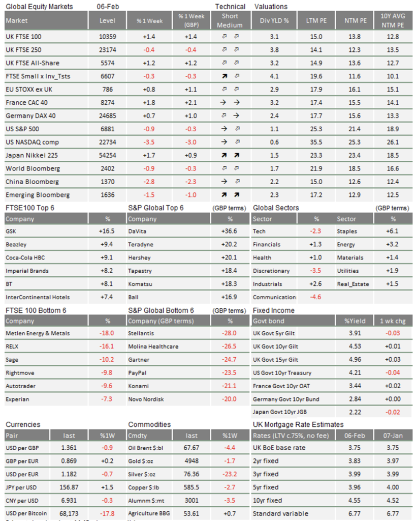 US tech stocks dragged down overall global equity returns this week – the Nasdaq Composite index down nearly 3% in sterling terms. The AI theme that propelled the sector for years is now causing a crisis of confidence, over a potential growth shock.