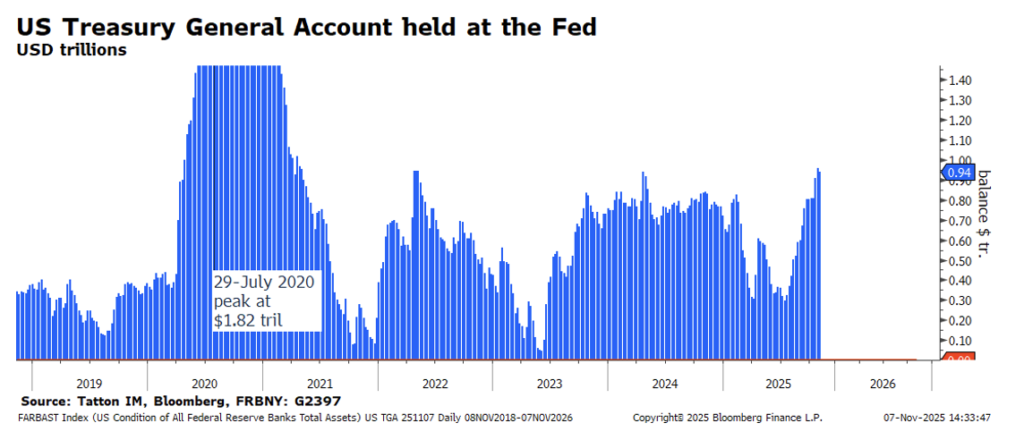 Amid these market jitters, we should remember that the long-term investment outlook is solid. Global growth seems to be improving, and corporate profits have stayed strong virtually everywhere. If you are bullish about long-term growth and markets drop back, that suggests there is a buying opportunity. Investors probably will not feel that way until the US government shutdown ends, but once that happens – and the TGA balance starts flowing out again – we expect there will be more buyers than sellers again.
