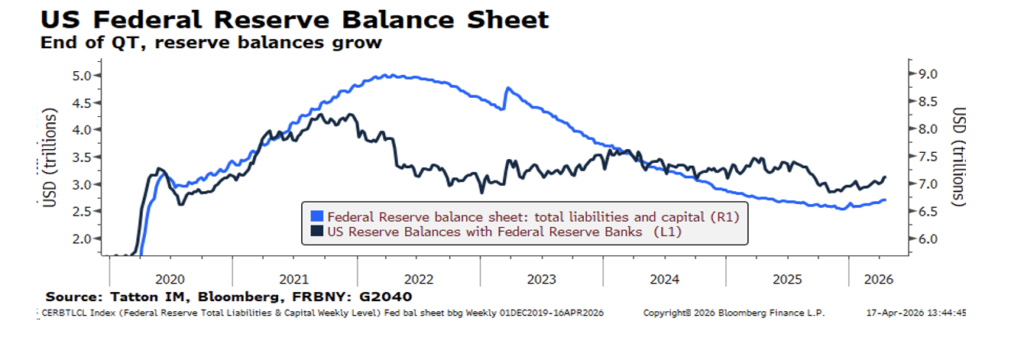 The good mood is helped by improving liquidity conditions this year. Liquidity was tight into the end of 2025, as the Fed tightened its provision and the US government shutdown sapped money from the system. Those conditions made markets react more negatively than you might have otherwise expected. If the Iran war had happened a few months ago, the selloff probably would have been worse. Since the start of 2026, though, the Fed has shifted from net bond sales to net purchases, easing liquidity conditions (the upwards tilt of the blue line in 2026 in the graph below).