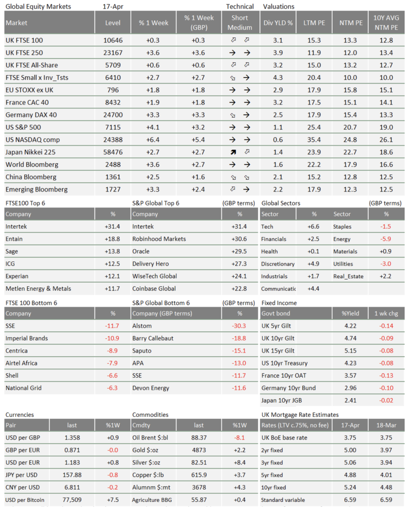 As we were writing, Iran declared the Strait of Hormuz “completely open” and markets rose sharply. This time, bond yields fell back too. Even before that announcement, equity markets had, more or less, decided that the war is over – thanks to US-Iran talks and the Israel-Lebanon ceasefire. US stocks rose above their late February peak for the first time since the conflict began. Investors are now focussing more on strong earnings growth than geopolitical risks.