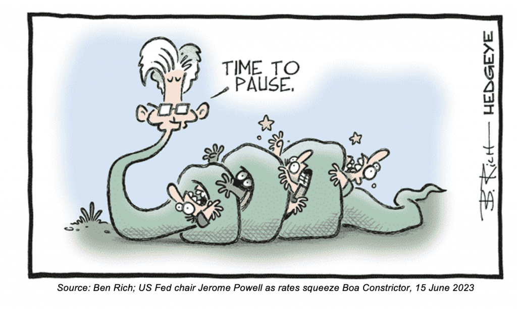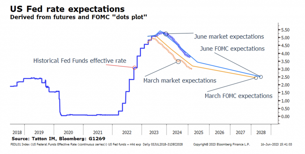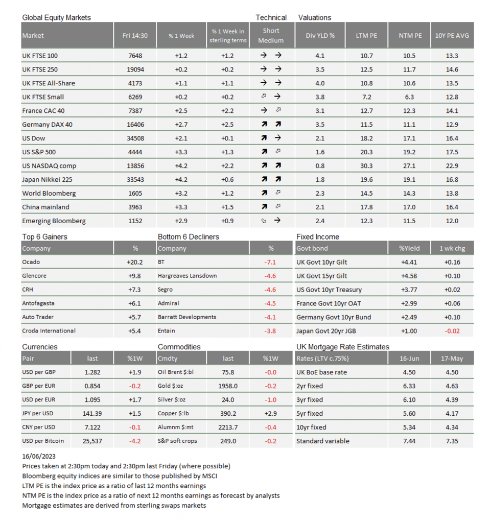 Last week saw equity markets move higher yet, despite central bank hawkishness. We had another 0.25% rate rise from the European Central Bank (ECB) and, although the US Federal Open markets Committee (FOMC) left rates unchanged, they gave us strong hints of at least another 0.25% hike in July. They also indicated their expectation for rates to stay higher for longer than many think.
