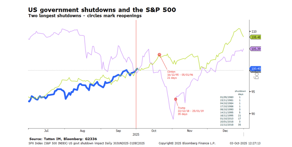 The US government shutdown drama is back on our screens – but markets are not tuning in. Stocks did not even bristle at Trump’s suggestion that the budget deadlock could be used as pretext for firing more federal employees, a kind of DOGE-by-proxy. Perhaps markets just see the government shutdown as mere political theatre that will be resolved (as it always has), or perhaps they think the economic impact will be mild. A quick resolution looks unlikely, but previous federal cuts under DOGE did not hurt US growth too much.