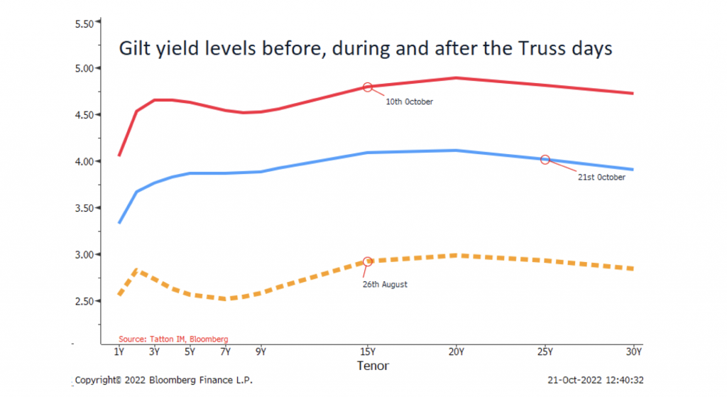 The chart below illustrates the wild and outsized movements in Gilt yields that the very short but also very turbulent, reign of the Truss government bestowed on the UK. The three lines show the different yield levels over different maturity bands in years (Tenor) on 26 August (dashed yellow, before ‘Trussonomics’), 10 October (red line, the highs of the Trussonomics implosion) and 21 October in blue, after the hapless Prime Minister had resigned.