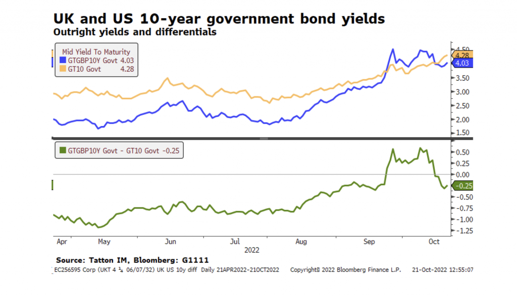 On the other hand, the UK Government bond (Gilt) market was cheered by the successful revolt against fiscal largesse. Yields are not yet back to August levels, but then neither are US yields, despite the US not experiencing any fiscal policy upheaval. Indeed, US yields have again risen while the Gilt market has experienced a significant bounce in prices which, as we explain in much more detail in a separate bond primer article this week, means that Gilt yields have corrected downwards.
