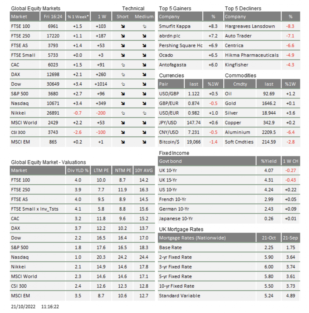 UK inflation (as measured by the Consumer Prices Index) was interesting this week, with food and insurance leading the core (non-energy prices) back up to 10.1%. Both may be seeing lagged impacts from previous energy price rises – but also the shortage of available labour. Our food has become much more energy-intensive in recent years. Indeed, the lagged impacts of energy are still evident across the board. Overall, and compared to previous weeks, the market has been cheered by a lessening of the sense of crisis around Europe and the UK, even if the backward- looking economic data reports still look concerning.